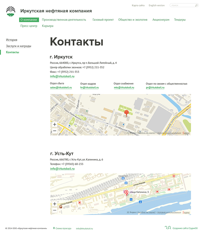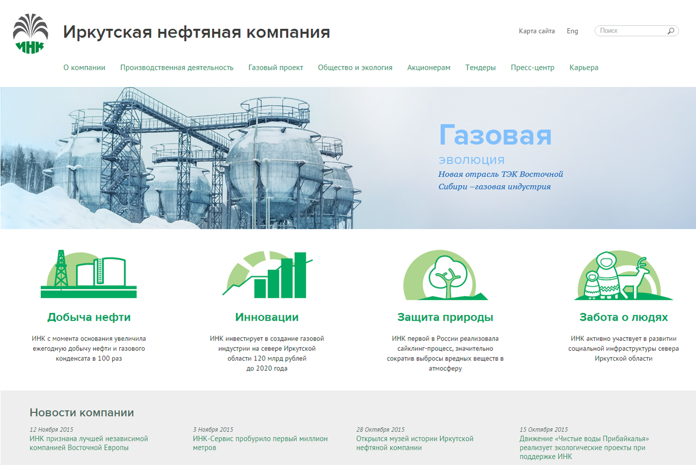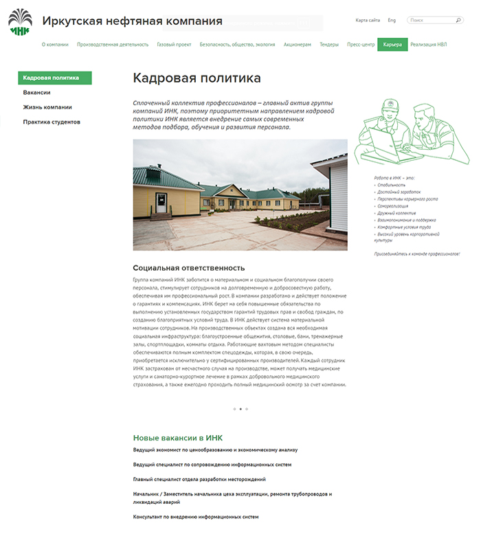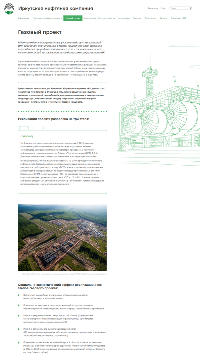 Динамичное развитие Иркутской нефтяной компании потребовало обновления ее информационных ресурсов, в том числе сайта, чья ежедневная аудитория достигла 1500–1700 посетителей (это 9–10 тыс. просмотров).Задача была неординарной — сочетать удобство интерфейса, запоминающуюся инфографику, яркие цвета с простотой изложения информации. Сделать сайт, что называется, «на вырост».Адикт успешно справился с этой задачей. Для реализации замысла, впрочем, потребовалось увеличить сроки работы, но в целом удалось достичь цели. После обновления сайт ИНК стал удобнее не только для сторонних посетителей, но и для сотрудников подразделений компании, которые ежедневно используют этот инструмент в своей работе: размещают вакансии, тендерную документацию, новости.