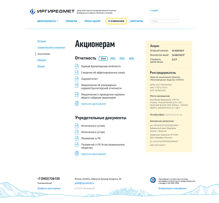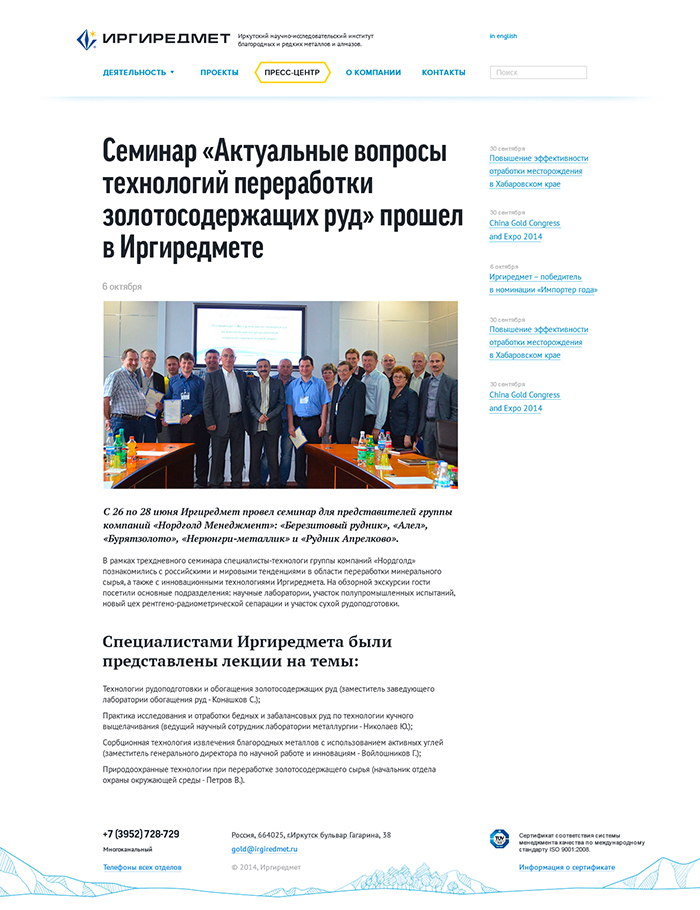 Перед нами стояла задача отобразить на сайте все направления деятельности компании, ее новости, филиалы, корпоративные ценности. В конечном счете у нас получился удобный, красивый сайт, подтверждающий статус компании Иргиредмет как лидера в своей области.