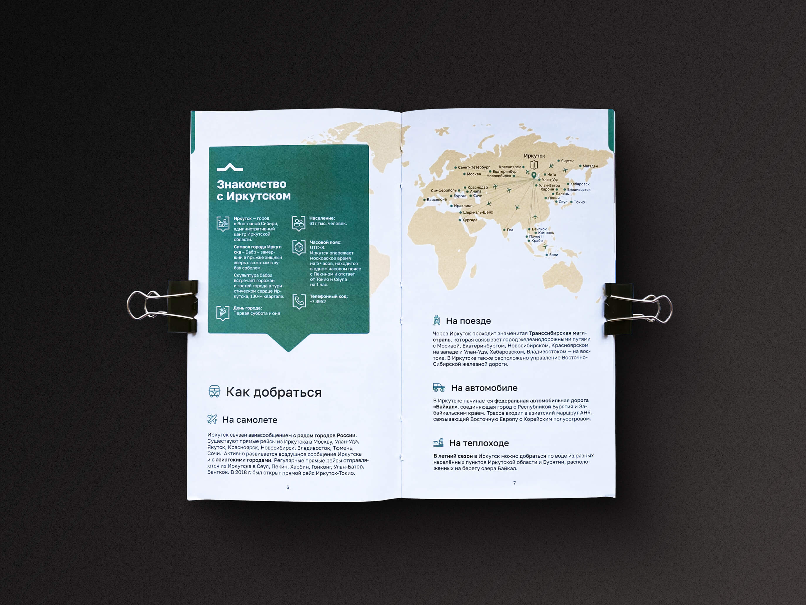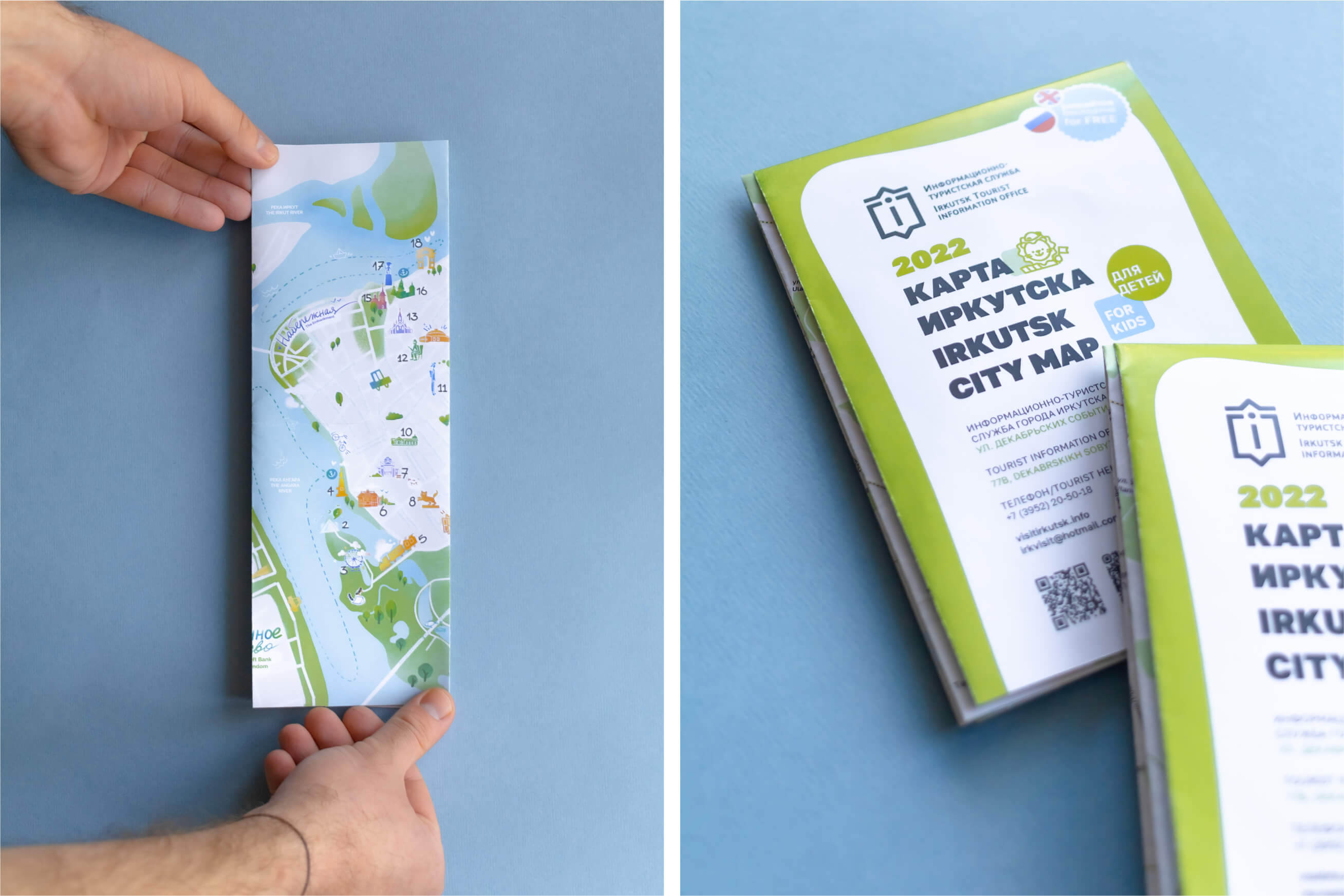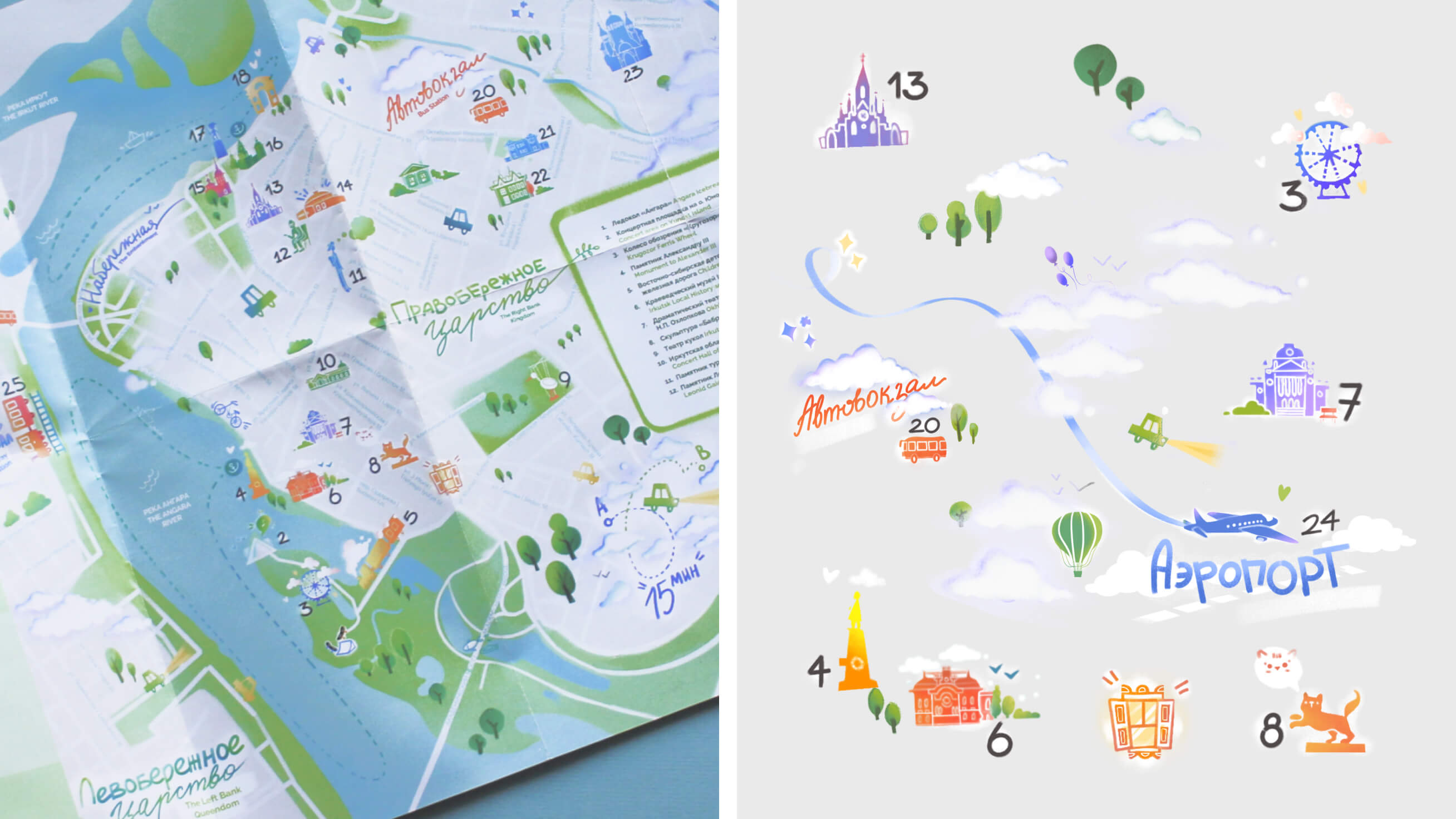 Обновили карту города для туристов, нарисовали яркую интерактивную карту для детей с уникальными иллюстрациями и сверстали два удобных путеводителя по Иркутску.