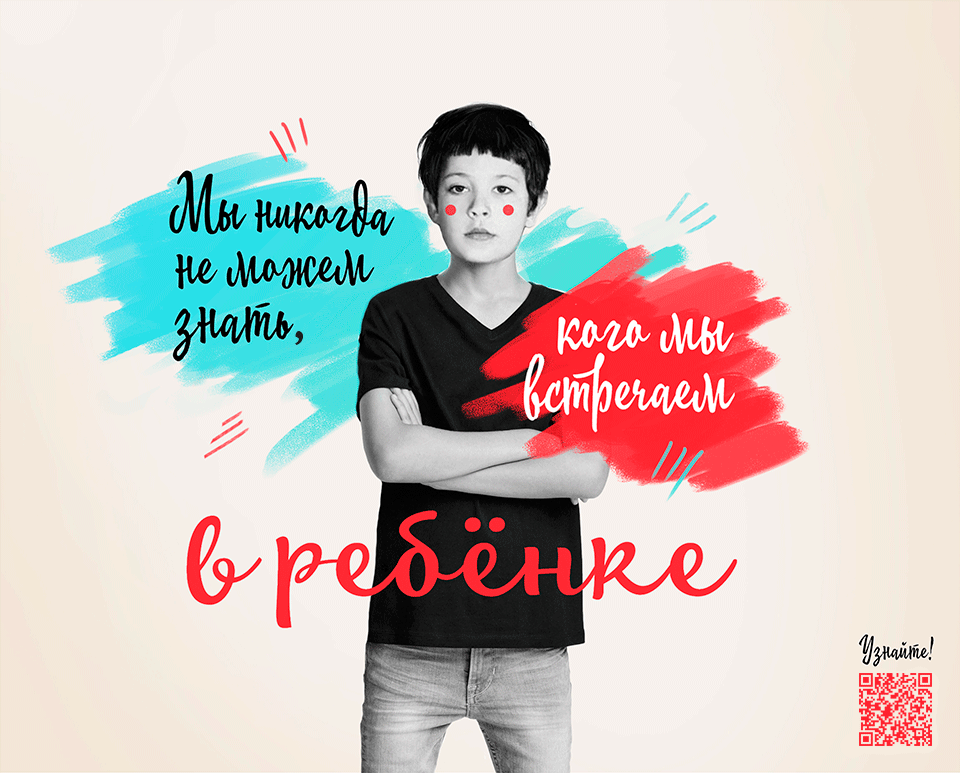 По QR-коду можно узнать, какой выдающийся человек вырос из ребенка, изображенного на плакате.