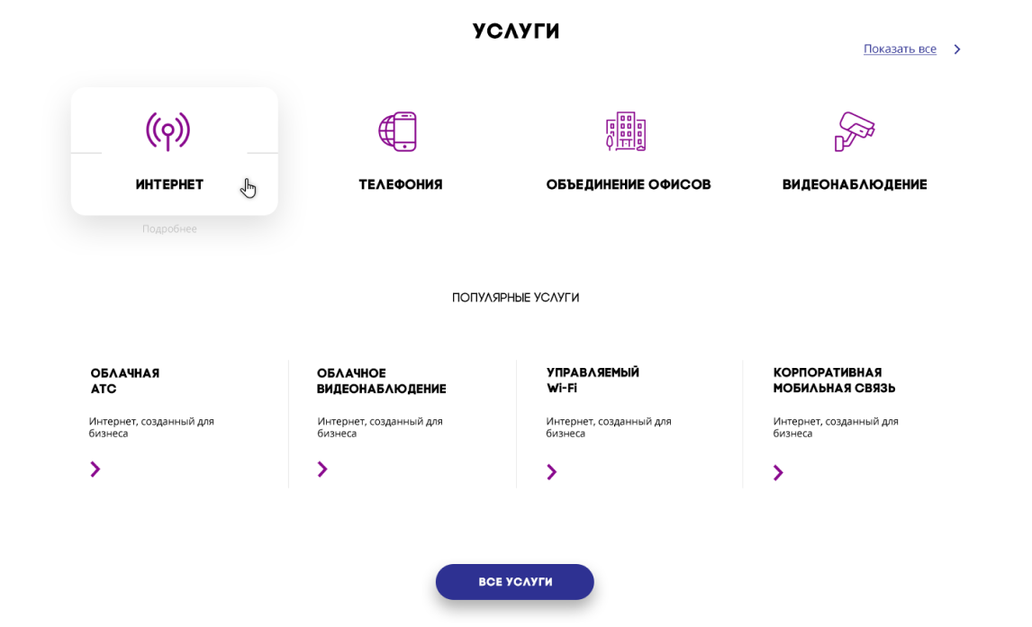 Так как все меню сайта скрыто в шапке (чтобы дизайн был более чистым, «воздушным»), мы создаем специальный блок, в котором показываем популярные направления компании и самые используемые из них услуги.