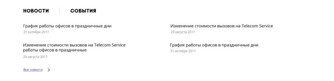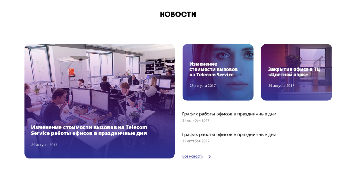 Данный блок визуально разгружает пользователя и знакомит с важными событиями в жизни и деятельности компании.