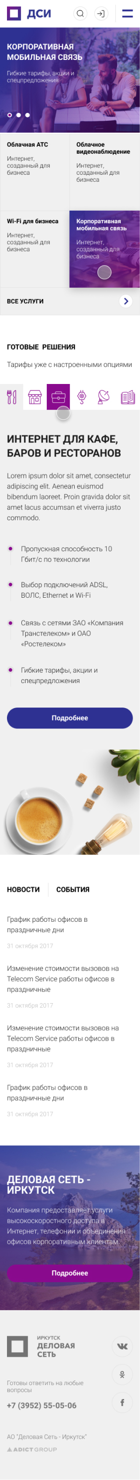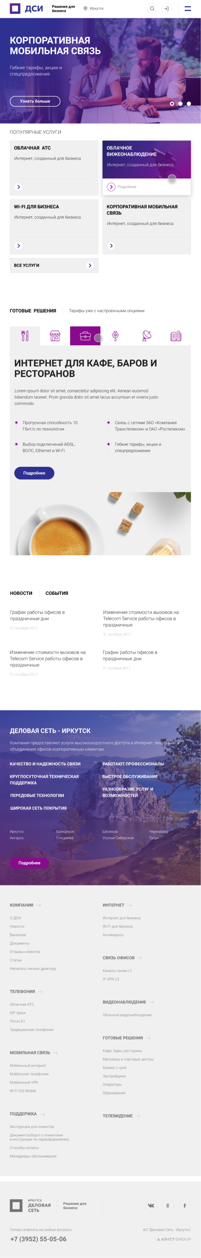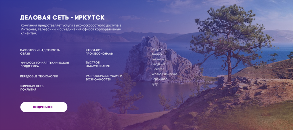 Сайт должен формировать имидж локальной компании. «Деловая Сеть — Иркутск» (ДСИ) — местный оператор с круглосуточной технической поддержкой и офисами обслуживания в Иркутской области.